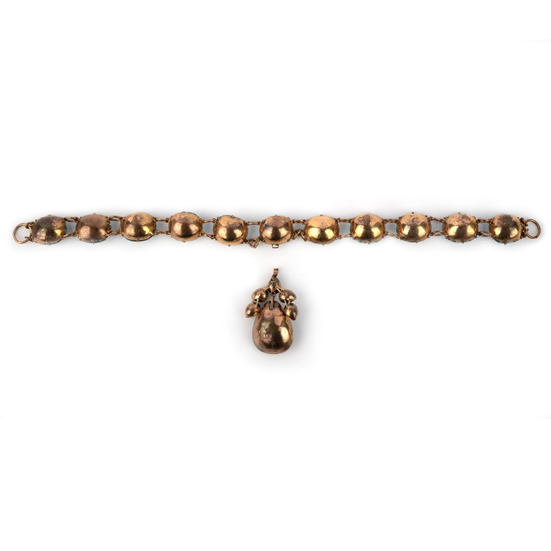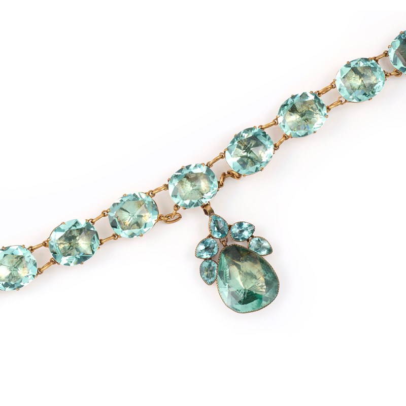 A rare 'Queen Anne' paste necklace, mid 18th century, composed of oval rose-cut pale blue 'aquamarine' pastes, claw-set in foiled gilt metal settings, suspending a similar pear-shaped pendant, connected by gilt metal chain links, the back with hoop fittings intended for a ribbon, length 26cm, length at front 6cm
