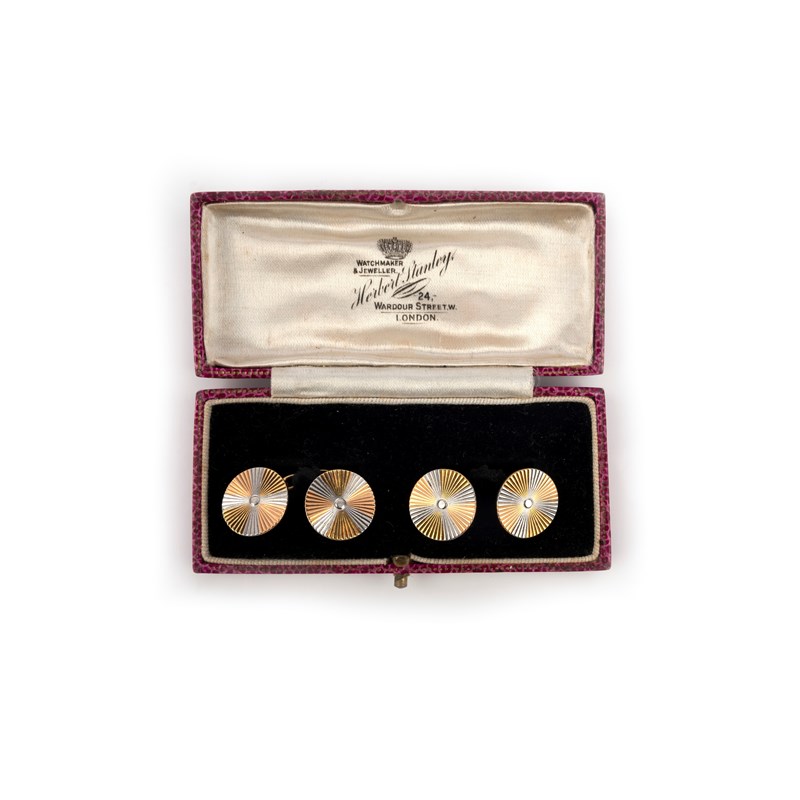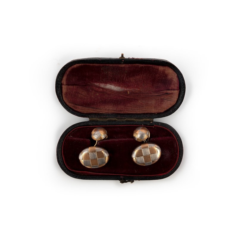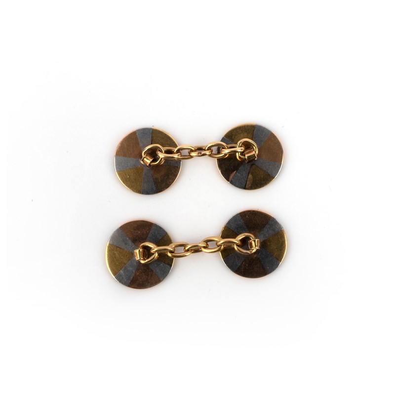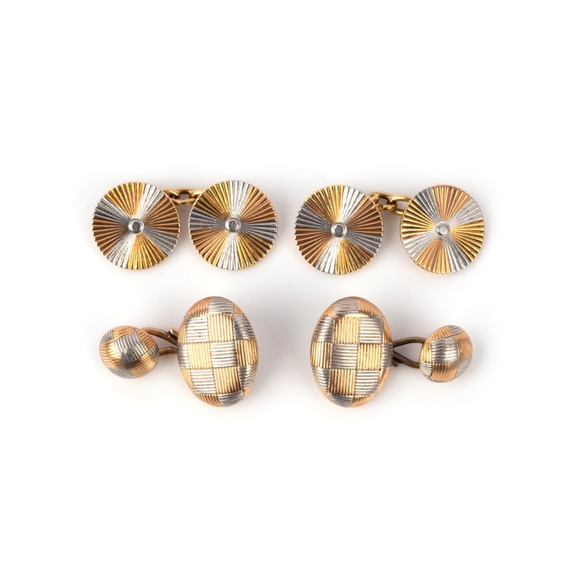 Two pairs of gold cufflinks, early 20th century, comprising: a pair of cufflinks, the larger oval and smaller circular ends each with a grid design in bicoloured gold, to S-shaped connecting links, larger ends each 1.8 x 1.4cm, case; and a pair of cufflinks composed of circular ends with radiating designed in three-coloured gold, to chain connectors, diameter of each end 0.9cm, case