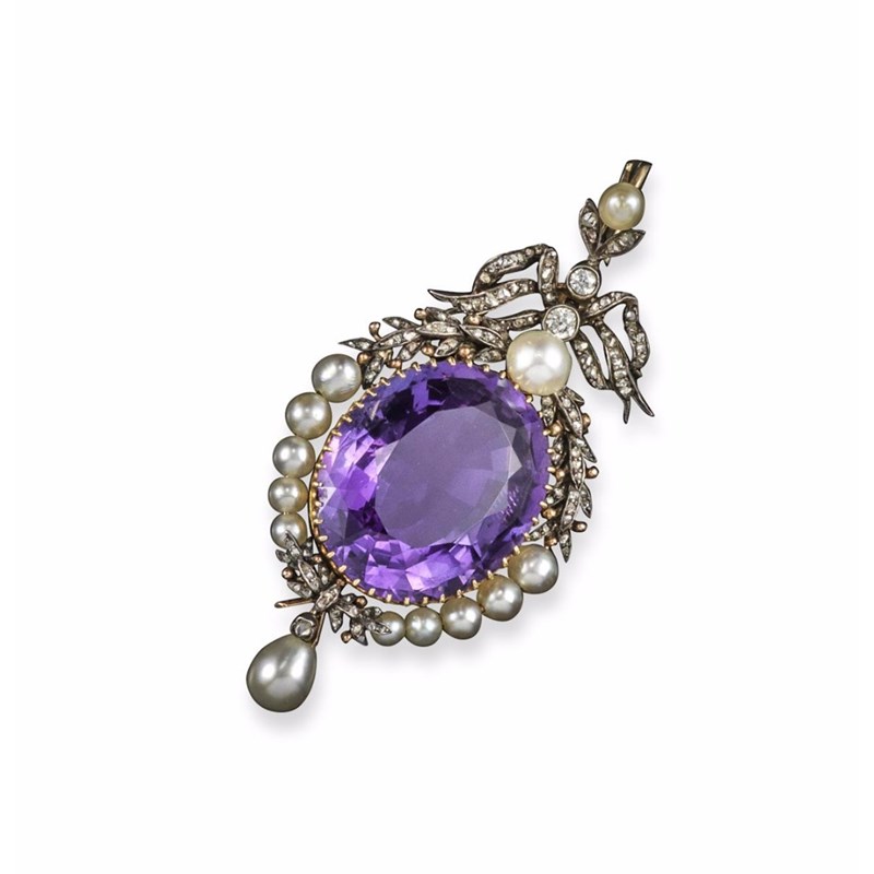 A late Victorian amethyst, pearl and diamond pendant, the large oval-shaped amethyst is set within a diamond-set laurel and pearl border. Beneath a diamond-set bow and bale, and suspending a further pearl in silver and gold. 6.2cm long.