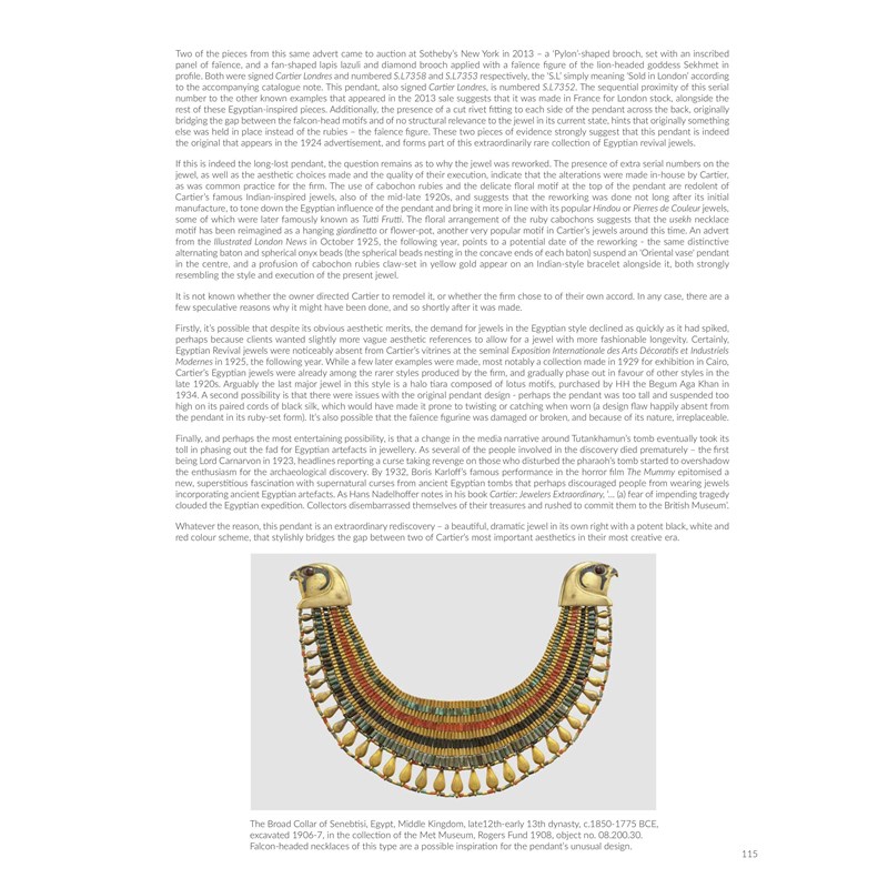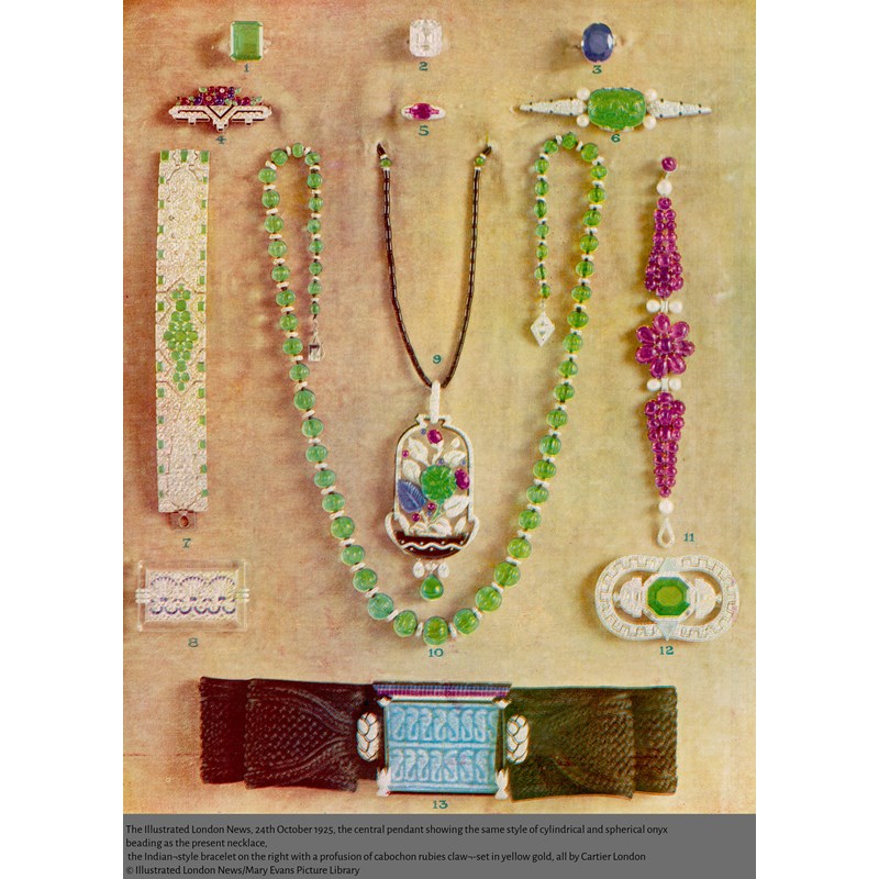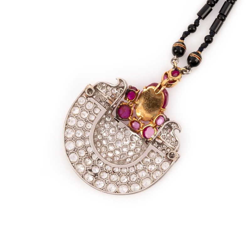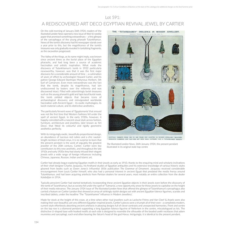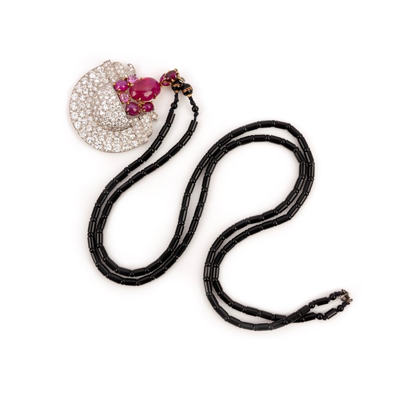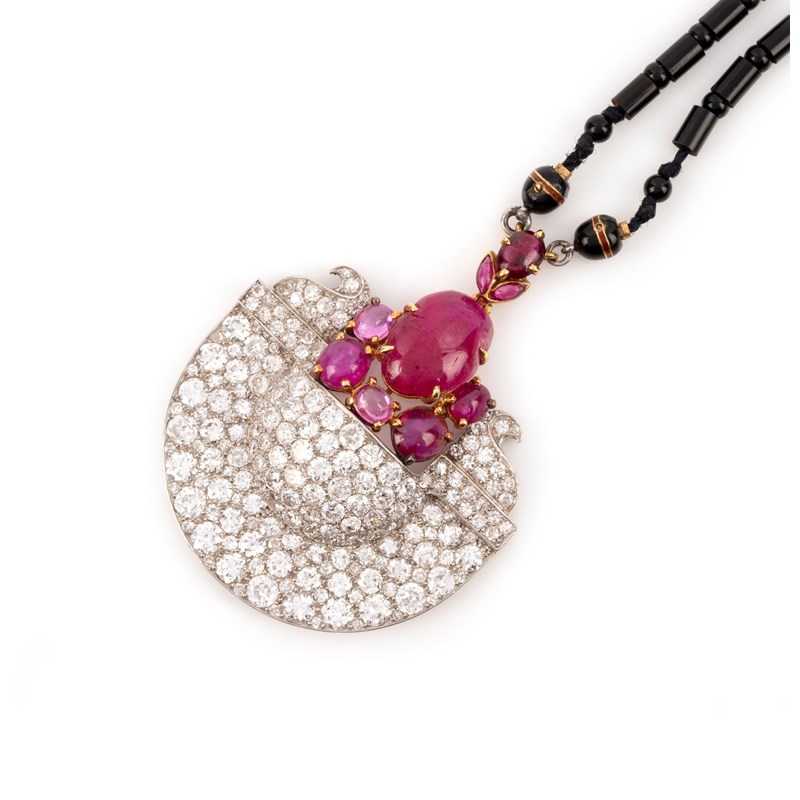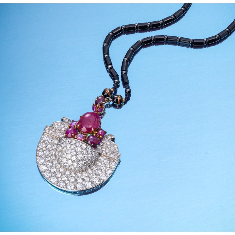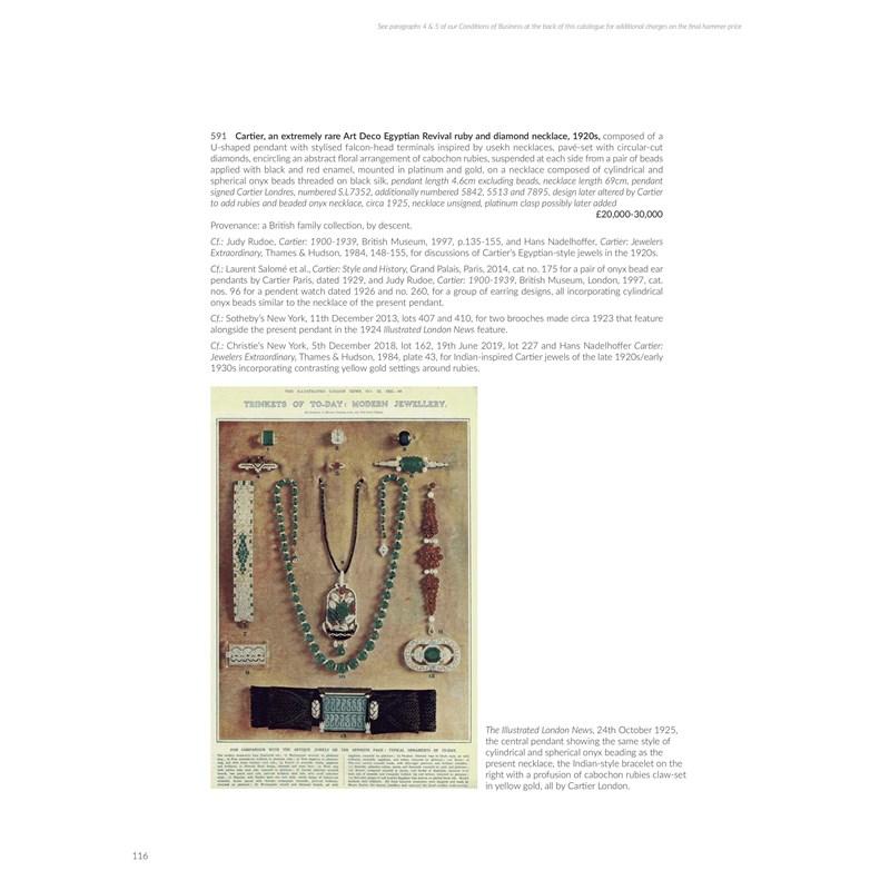 Cartier, an extremely rare Art Deco Egyptian Revival ruby and diamond necklace, 1920s, composed of a U-shaped pendant with stylised falcon-head terminals inspired by usekh necklaces, pavé-set with circular-cut diamonds, encircling an abstract floral arrangement of cabochon rubies, suspended at each side from a pair of beads applied with black and red enamel, mounted in platinum and gold, on a necklace composed of cylindrical and spherical onyx beads threaded on black silk, pendant length 4.6cm excluding beads, necklace length 69cm, pendant signed Cartier Londres, numbered S.L7352, additionally numbered 5842, 5513 and 7895, design later altered by Cartier to add rubies and beaded onyx necklace, probably circa 1925, necklace unsigned, platinum clasp possibly later addedProvenance: a British family collection, by descent.