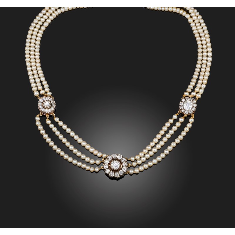 A Victorian natural pearl and diamond necklace, late 19th century composite, the three rows of