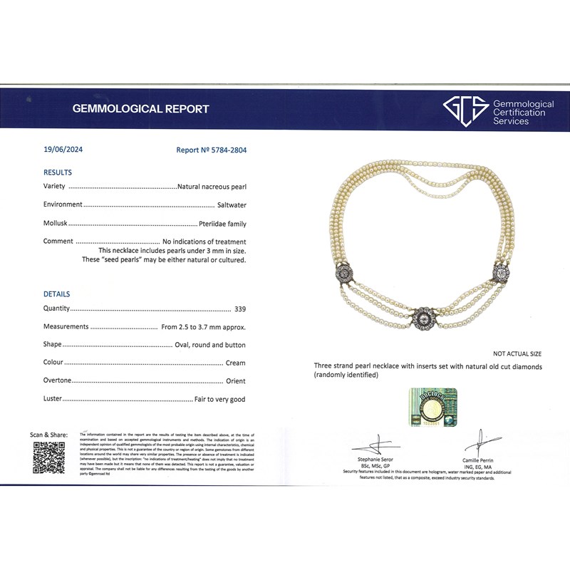 Accompanied by GCS report no. 5784-2804, dated 19th July 2024, stating that the pearls are natural saltwater.