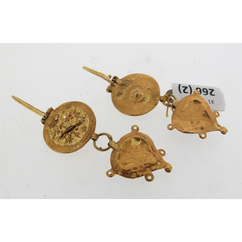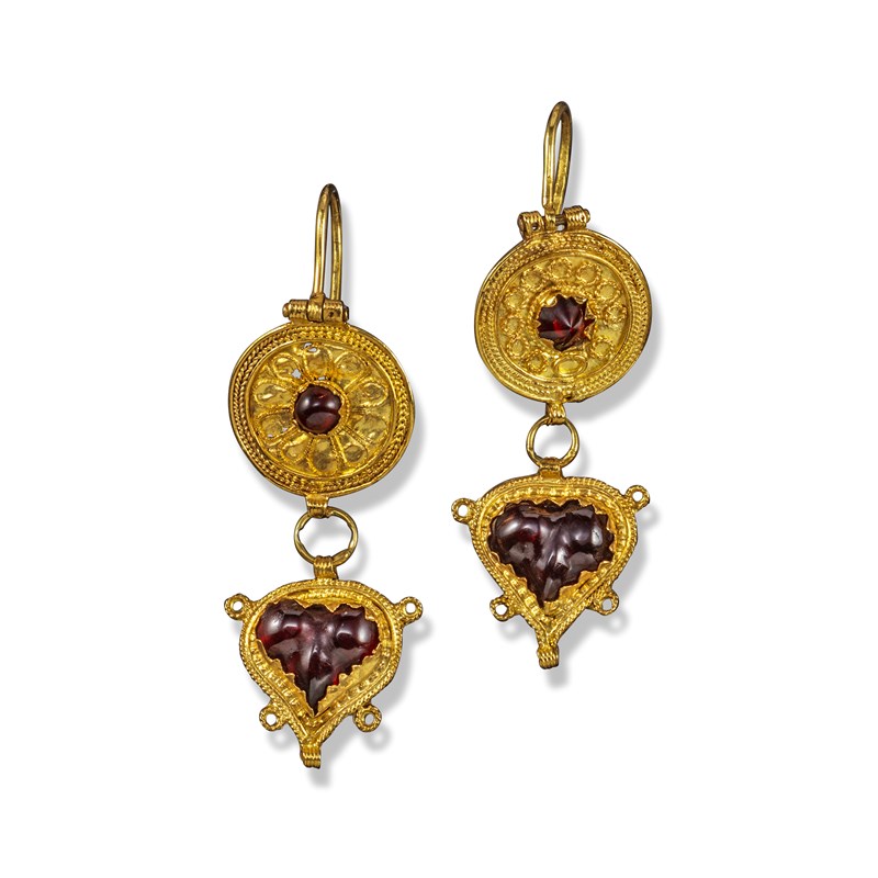 A pair of gold earrings in the late Roman Empire style, of circular disc design centred with a circular cabochon garnet supporting a heart-shaped gold disc set with a lobed heart-shaped cabochon garnet, hinged wire hoop to the upper section, 5.5cm high