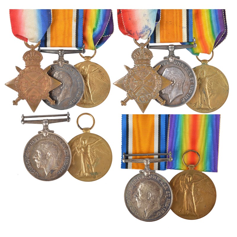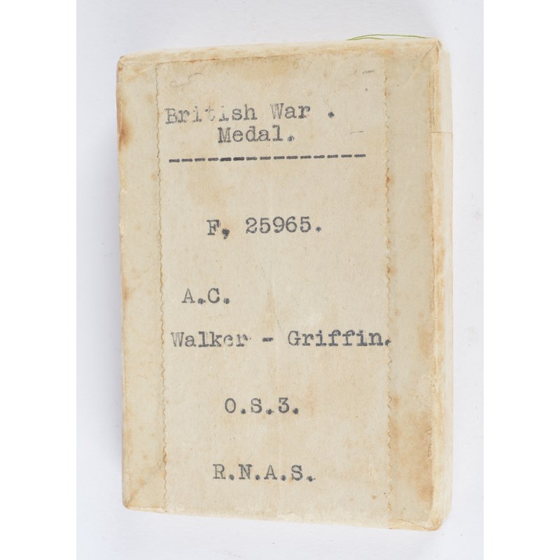 A small collection of Great War medal groups, comprising: British War and Victory medals to Officer's Steward Arthur C. Walker-Griffin, Royal Naval Air Service (F. 25965 A.C. WALKER-GRIFFIN. O.S. 3. R.N.A.S.), extremely fine in BWM box of issue; the same combination to Private W.A Martin, Royal Fusiliers (GS-50115 PTE. W.A. MARTIN. R. FUS.), good very fine; A 1914 Star trio to Acting Corporal Robert William Brown, Royal Army Medical Corps (2408), good fine; and an 1914-15 Star trio to Private Bidwell, The Queen's Regiment: 1914-15 Star (1531, PTE. P.F. BIDWELL, THE QUEEN'S R.), BWM (1531 PTE. .E. BIDWELL. THE QUEEN'S R.), Victory Medal (1531 PTE. P. F. BIDWELL. THE QUEEN'S R.), very fine.