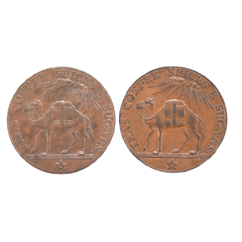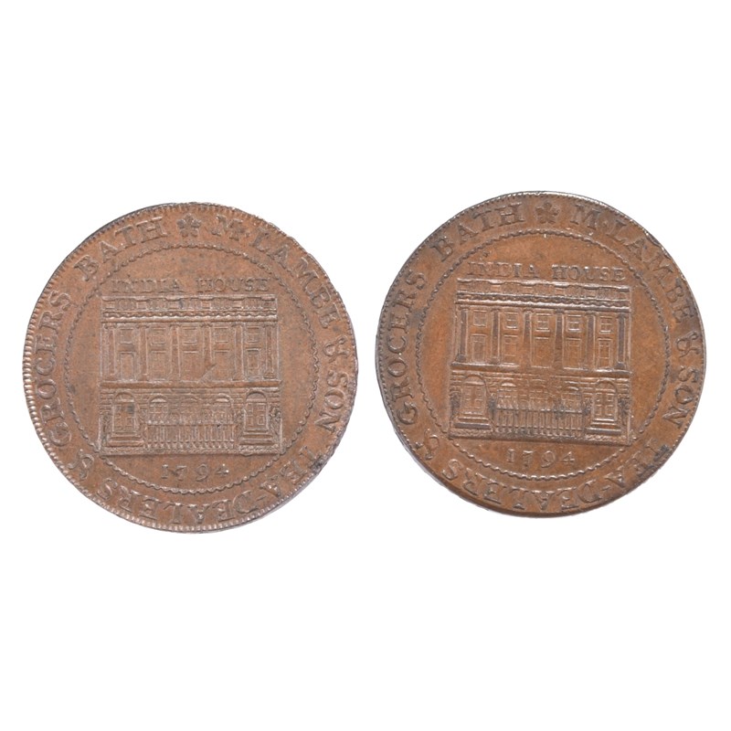 18th century tokens: Somerset, Bath penny, M. Lambe & Sons, camel standing, rev. India House 1794, edge PAYABLE IN LANCASTER LONDON OR BRISTOL, 12.03g (Withers p. 318), nearly extremely fine; and another similar, edge PAYABLE BY M. LAMBE & SON, 10.18g, near very fine. [2]