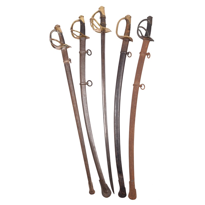 A collection of five 19th century cavalry troopers' swords, comprising: a French heavy cavalry sword, marked for Klingenthal 1826; a French model 1822, modified type, steel scabbard; a French model 1882, steel scabbard; a French light cavalry sword, steel scabbard; and a United States cavalry sword, brass three bar hilt, steel scabbard. [5]