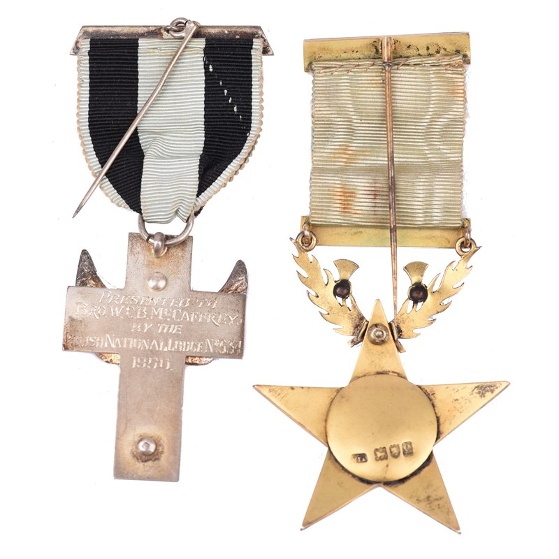 Freemasonry: two jewels, one from the Polish National Lodge, 1950, Latin cross 38mm wide, surmounted by a crowned eagle with raised wings, reverse inscribed to 'BRO. W. C. B. McCAFFREY', extremely fine; the other a Founder's Jewel of Gwelo Lodge No 876S.C, silver-gilt five pointed star 54mm, set with an enamelled roundel depicting a charging lion pierced with a spear, assegai and a native shield at its feet (similar to the reverse of the B.S.A.Co. Medal), suspension involving enamelled sprays of thistles, nearly extremely fine. [2]