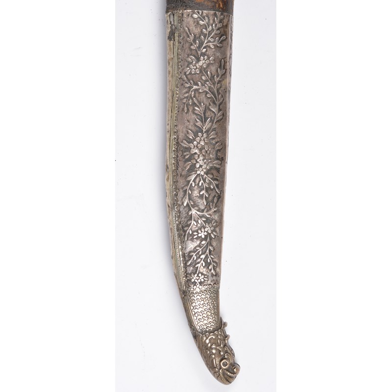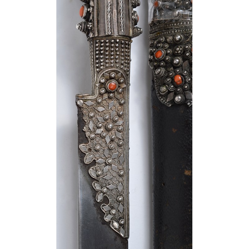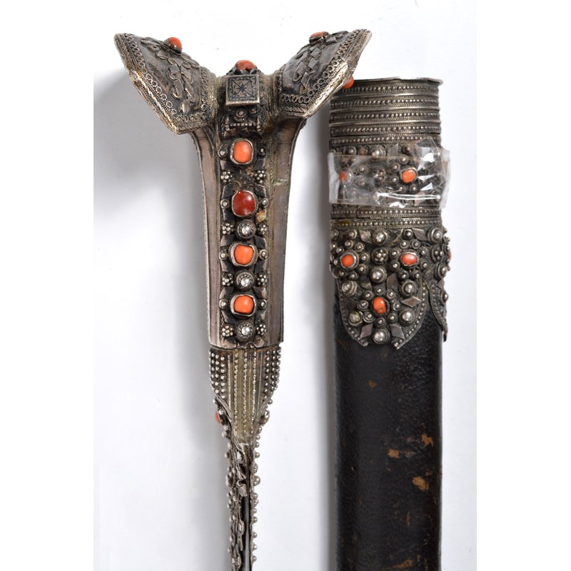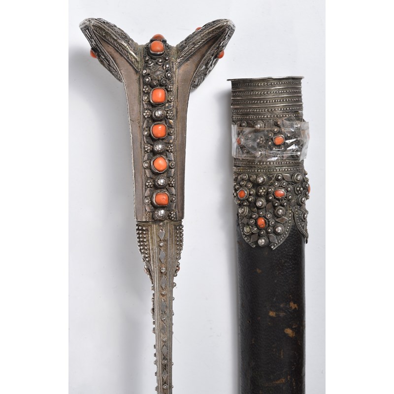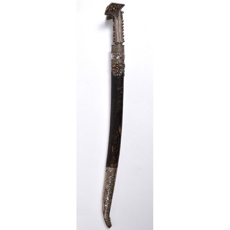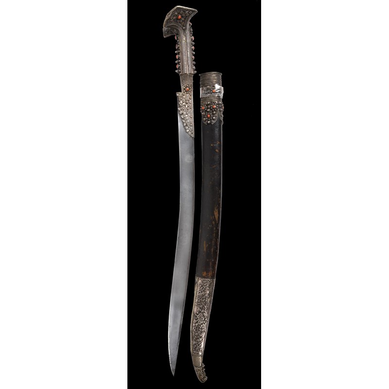 A good Turkish sword (yataghan), forward curving blade 23 in., with narrow back fullers and panels of silver koftgari; silver hilt of characteristic form, with angular flaring terminal, adorned with silver beads and bands of braided wire and set with coral cabochons; leather covered scabbard, the locket en suite to the hilt, the later chape of white metal embossed with foliage and with monstrous head terminal.