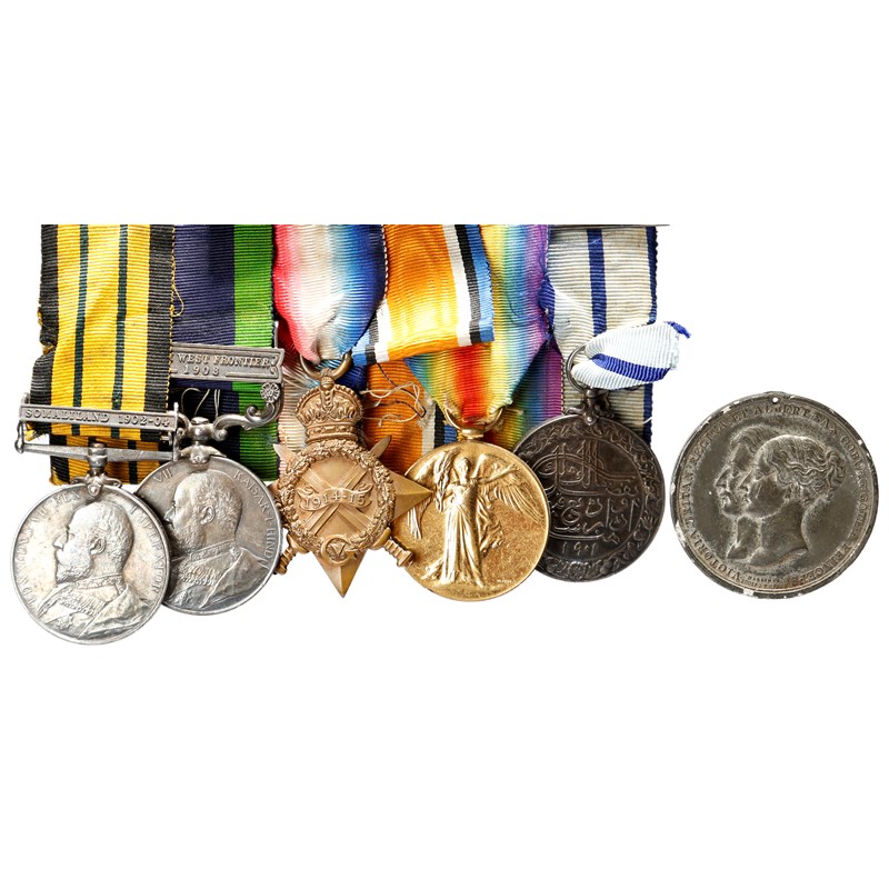 Five medals to Major J. S. Crosthwaite, Indian Army: Africa General Service 1899-1956, clasp: Somaliland 1902-04 (LIEUT: J.S. CROSTHWAITE. 27/PUNJABIS), impressed in plain capitals; India General Service 1908-35, clasp: North West Frontier 1908 (Lieut. J. S. Crosthwaite 27th Punjabis), engraved in running script; 1914-15 Star (CAPT. J.S. CROSTHWAITE. I.A.), Victory Medal (MAJOR J.S. CROSTHWAITE); Delhi Durbar 1903, unnamed as issued; cavalry mounted, broken group as lacking BWM, a few edge nicks but medals are otherwise good very fine and toned, 1914-15 Star ribbon cut through and mounting generally somewhat insecure; together with a white metal medal commemorating the marriage of Queen Victoria and Prince Albert, fair.