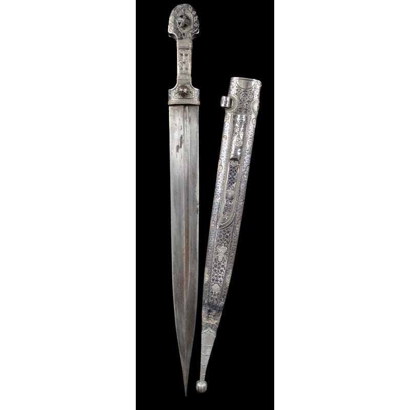 A fine Caucasian dagger (kindjal), stout blade 17 in., with long point and eccentric fullers; hilt and scabbard of characteristic form with arched pommel and melon shaped chape, and clad in nielloed silver profusely decorated with scrolling foliage in panels.