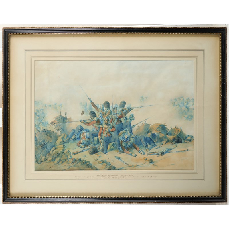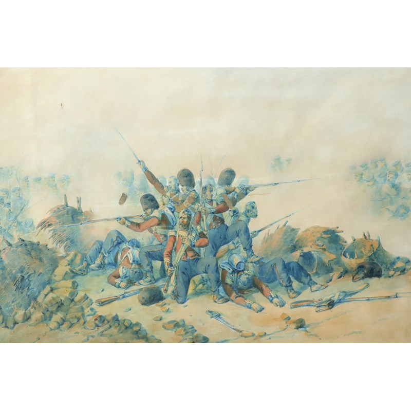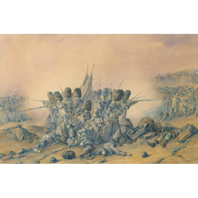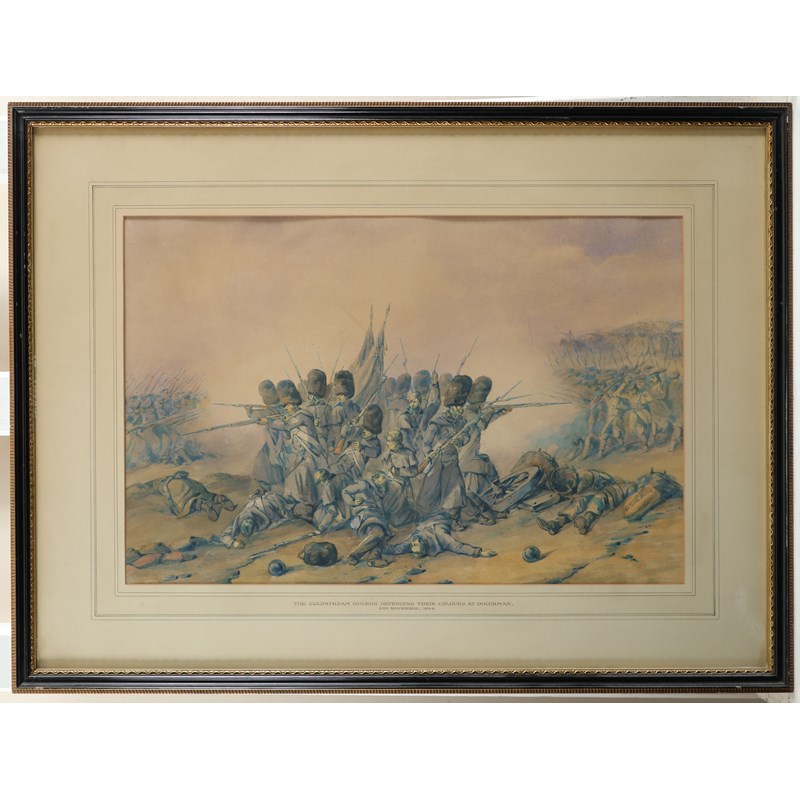 The Battle of Inkerman: The fierce struggle between the Coldstream Guards and overwhelming masses of Russians for the Sandbag Battery, Captain Hon. P. Fielding wounded; The Coldstream Guards under Lt. Col. Henry J.W. Bentinck (wounded), hotly sustaining the attack of the Russian masses; The Coldstream Guards defending their colours