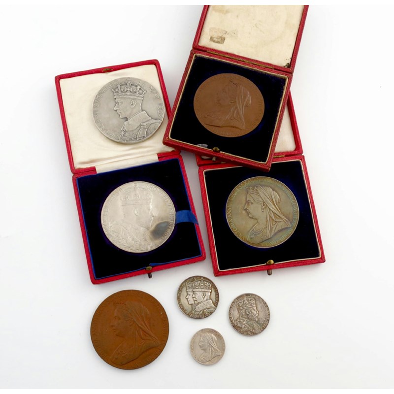 A group of official Royal Mint medals; Victoria, Jubilee 1897, large silver and bronze; Edward VII, 1902, large silver, all cased; 1897 bronze; 1937, large silver; and small silver (3), 1897, 1902, 1935. Cased medals extremely fine, others nearly so. (8)