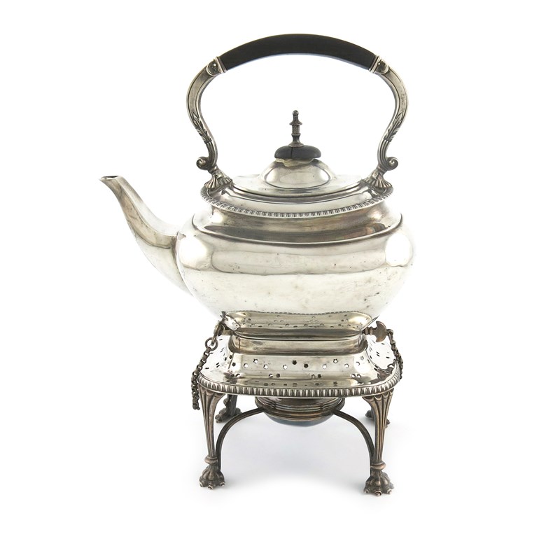 rounded rectangular form, central carrying handle, gadroon borders, stand of rounded rectangular form, on four fluted legs with paw feet, with a burner, height 28.5cm, approx. weight 34.7oz.