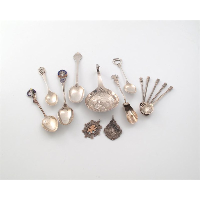 A mixed lot of silver flatware and two medal pendants including:
