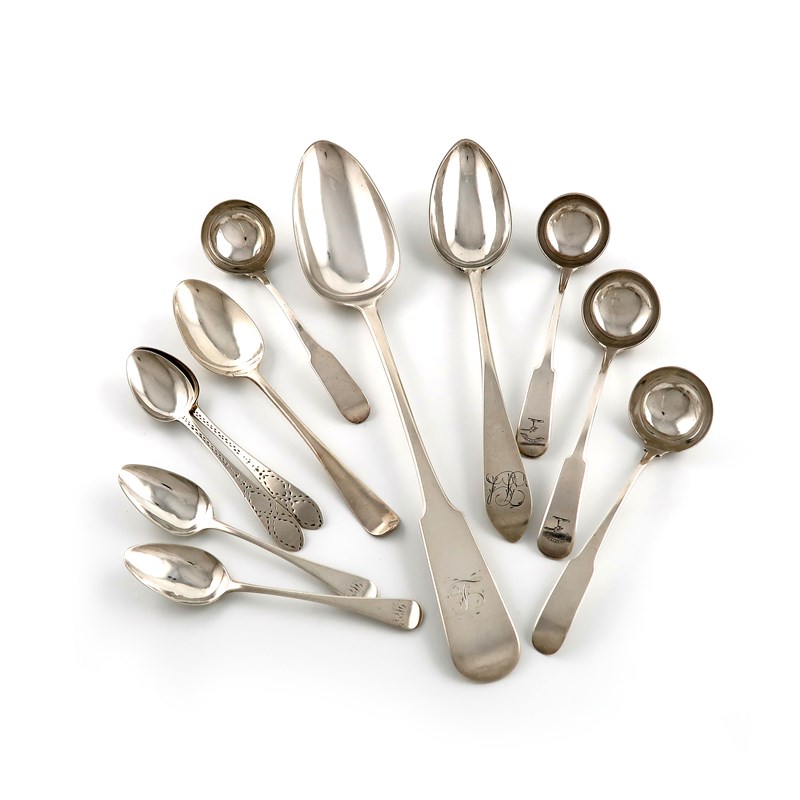 comprising: a pair of toddy ladles, by Joseph Pearson, Dumfries circa 1810, a tablespoon by Thomas Davie, Greenock, circa 1820, a pair of teaspoons, by William Hannay, Paisley, a pair of teaspoons, by William Jamieson, Aberdeen, plus an Edinburgh basting spoon, a pair of toddy ladles, by William Cunningham, and a dessert spoon, approx. weight 11.8oz. (qty)
