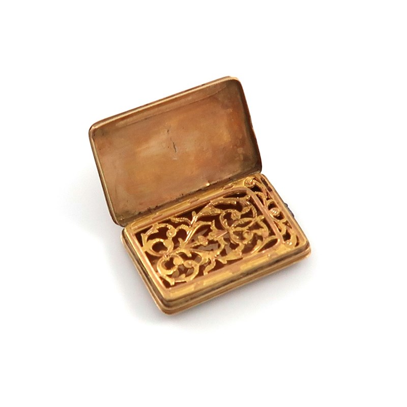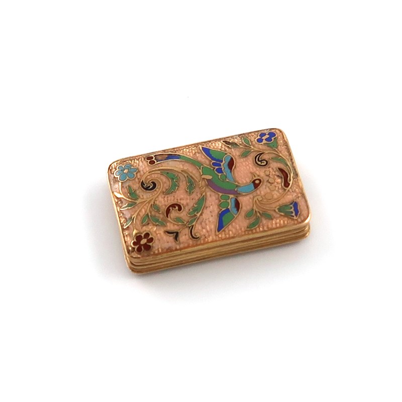 rectangular form, enamelled with a bird and foliate decoration on a peach background, the interior with a hinged pierced grille, length 2.6cm, approx. weight 7.1g