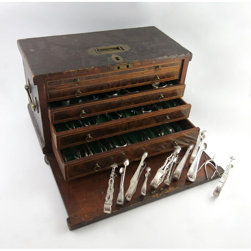 the majority antique, comprising: a pair of early 19th century Scottish provincial silver sugar tongs, by James Orr, Greenock circa 1814, plus various towns, including Glasgow, Newcastle, Edinburgh, Dublin, York, London, Birmingham, and Exeter, plus a continental pair and an electroplated pair, in a fitted four drawer lockable cabinet with a key, approx. weighable 57.5oz. (47)