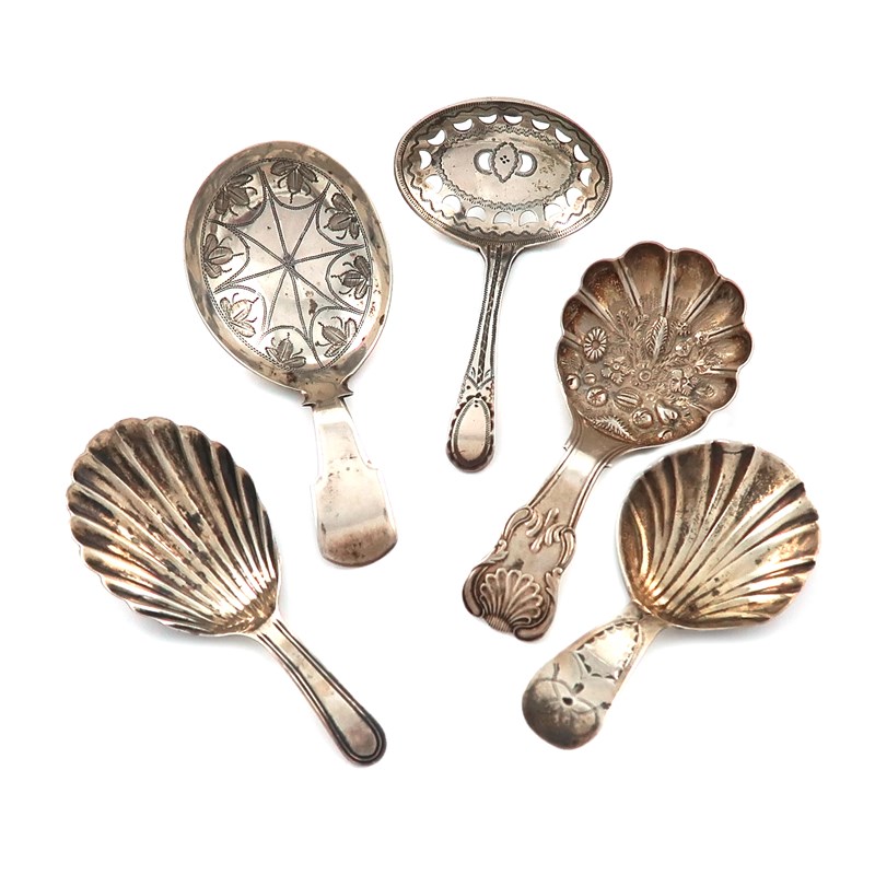 including: a William IV one by F. Clark, Birmingham 1834, King's pattern handle, embossed foliate bowl, one by George Burrows, London 1800, the oval bowl with pierced and engraved decoration, and three others, approx. weight 1.4oz. (5)