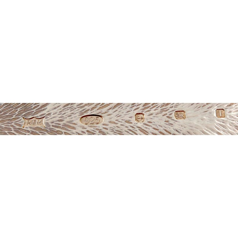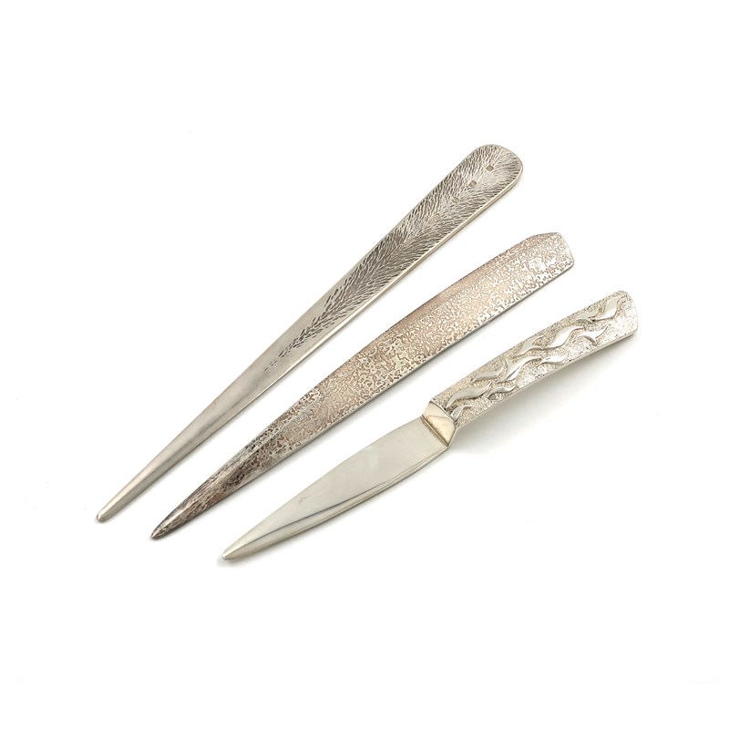 comprising: one by Esther Lord, Birmingham 2012, with etched decoration, length 20.8cm, one by Roger Squires, London 2013, the raised handle with flame decoration on a textured background, length 19.4cm, one by Ryan MacClean, Birmingham 2010, tapering form with feather textured decoration, length 24.2cm, approx. weight 8oz. (3)