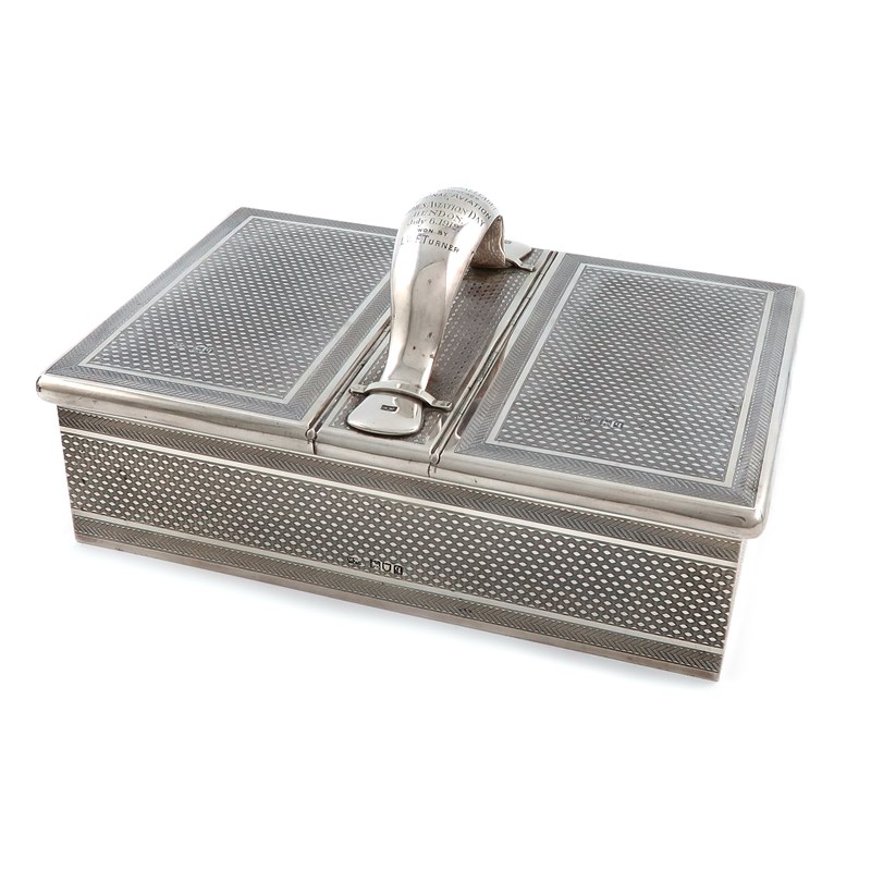 rectangular form, engine-turned decoration, with chevron borders, the two hinged covers open to reveal wood lined interiors, with a central strap work carrying handle, inscribed 'The London Aerodrome, Presented by Messrs' Mappin and Webb, to the Women's Aerial League to encourage National Aviation. Ladies Aviation Day, Hendon July 6 1912, won by L.W.F. Turner', length 24.4cm.