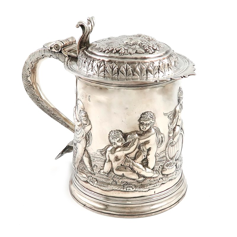 tapering circular form, later embossed with playful Bacchanalian Cherubs, scroll handle with a later crest, the hinged cover embossed with grapes and a mask, on a circular foot, height 18.5cm, approx. weight 25.9oz.