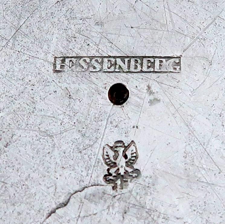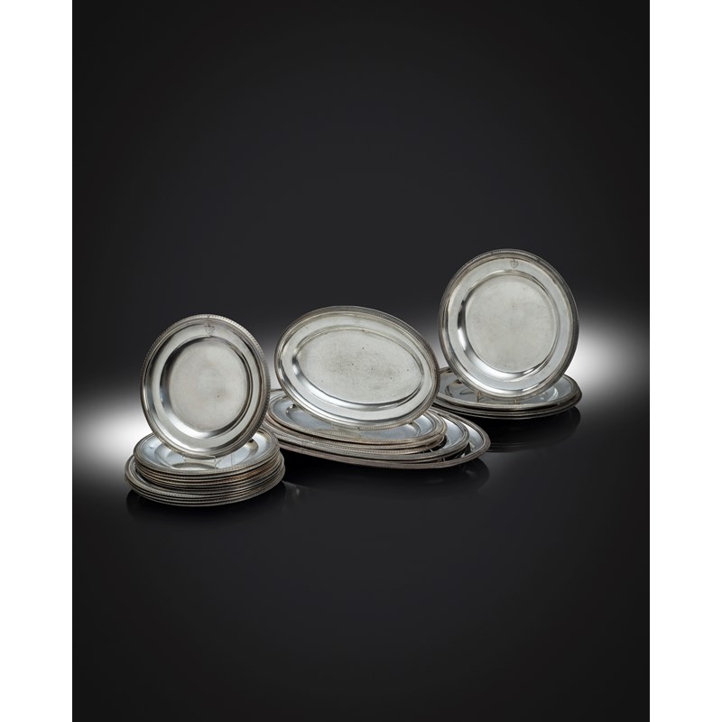 with a stiff leaf border, engraved with an armorial, comprising: eight dinner plates, a set of four larger plates, a large oval meat platter, three pairs of graduated meat platters, a pair of large circular platters, and a single circular platter, plus a matching German deep circular dish, by Hessenburg, Frankfurt, diameter of dinner plates 27.4cm, length of largest platter 62.5cm, approx. weight 940oz. (23)