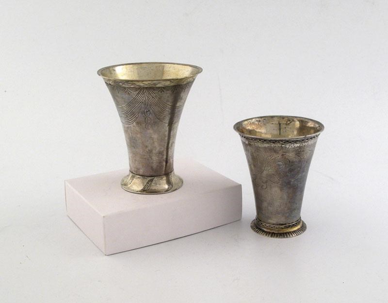 Two small parcel gilt Scandinavian beakers, with initials and wriggle engraving and flared bowls: the smaller one Swedish, Carl Fahlberg, Uppsala 1770; the other probably Finnish, maker 'GGF', probably Porvoo 1825, the latter 10cm high, 5oz. (2)