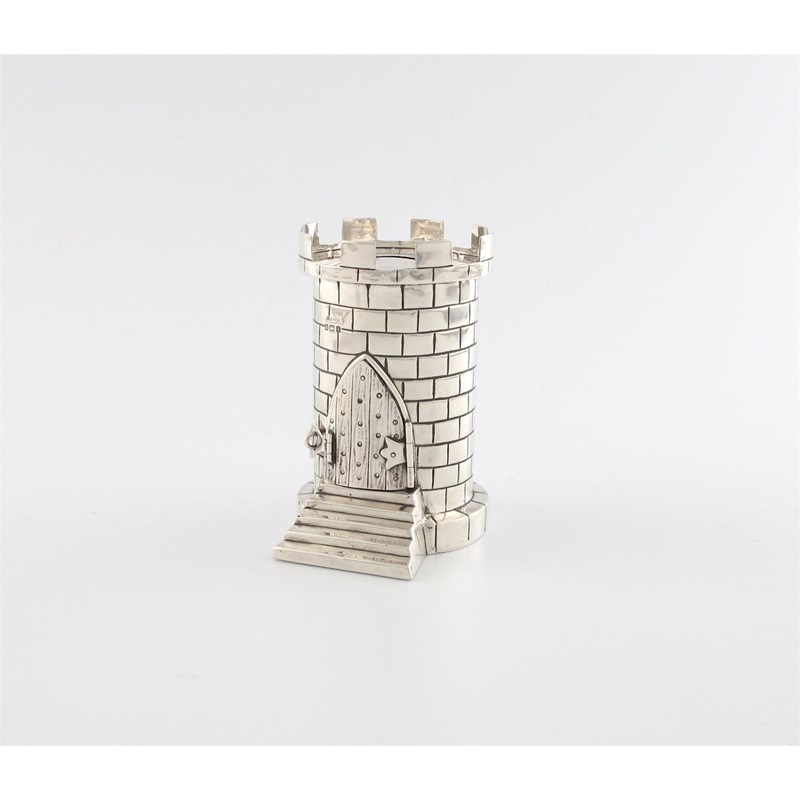 modelled as a castle turret, castellated top, hinged door with a clasp for a padlock, on a spread circular form with steps, height 9.4cm, approx. weight 2oz.