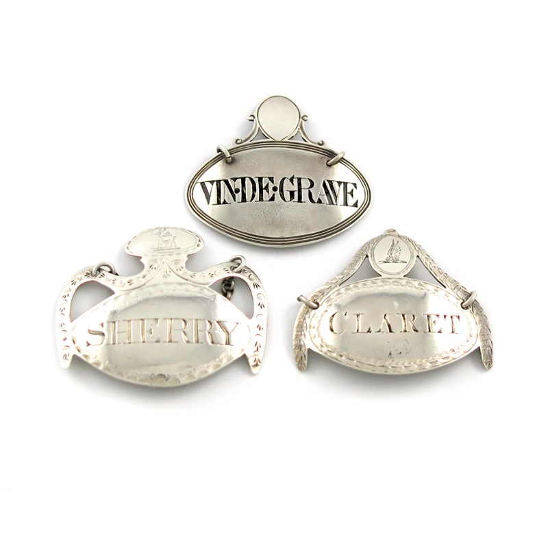 oval form, with pierced and raised shield pediments, bright-cut and thread borders, comprising: one by Elizabeth Morley, London 1799, pierced 'VIN DE GRAVE', one by Phipps and Robinson, incised 'CLARET' and one unmarked incised 'SHERRY', approx. weight 1oz. (3)