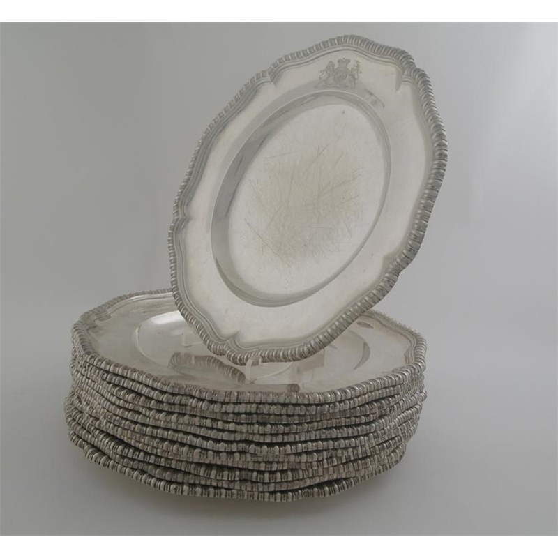 Royal Association. A matched set of twelve George III dinner plates, of shaped circular outline with gadrooned borders and engraved Royal Ducal Arms, the reverse with initials "EDC" & "EAFs", one by William Frisbee and eleven by William Stroud, London 1803, 9.8in (25cm) diameter, 227oz. (12)