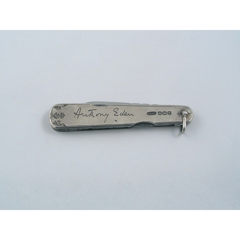 Political Interest; a modern folding knife, inscribed with the facsimile signature "Anthony Eden", with a coat of arms on the reverse, with two steel blades, a file and a cigar piercer, by G Ibberson & Co, Sheffield 1947, 3.1in (7.75cm) long.