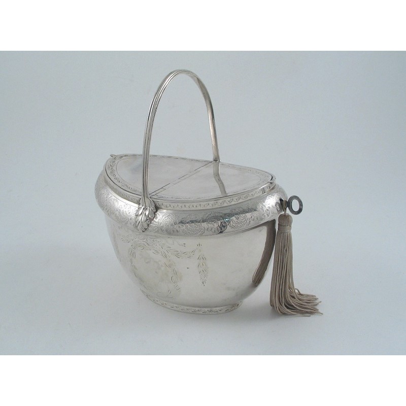 A George III bright engraved oval tea caddy, with a hinged lockable cover to either side of the fixed reeded carrying handle, the lobed ovoid body decorated with an upper and lower band of foliage either side of a vacant cartouche with tied ribbon surmount and foliate festoons to either side, with a single key with tassel, by John Emes, London 1800, 6.5in (17cm) wide, 15.5oz.