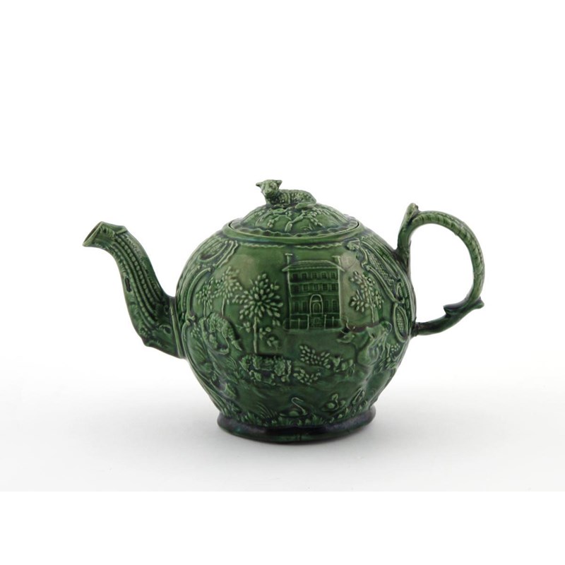 A rare green-glazed creamware 'landskip' teapot c.1765, probably Whieldon or Wedgwood, typically moulded to each side with a tall Georgian house behind sheep and cattle, swans swimming around the base, the cover with a recumbent lamb finial, the handle broken off and restuck, 20.5cm. (2)