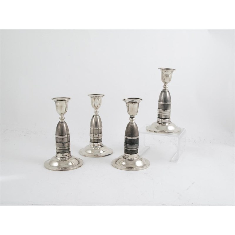 Boer War interest: A set of four mounted candlesticks, on domed bases with plain capitals and detachable nozzles, the columns formed from mounted military 'one pound' shells * by Alexander Jones, London 1900, retailed by "Jones, 41st James St", 6.3in (16cm) high. (4) * These shells are probably from a Boer "Pom-Pom" gun, which was essentially a converted Maxim machine gun that had a firing rate of 60 rounds per minute - but usually had a belt of 25 one pound shells. Australians at Elands River Post, South Africa said it could cover an acre with shells as fast as a person could count.