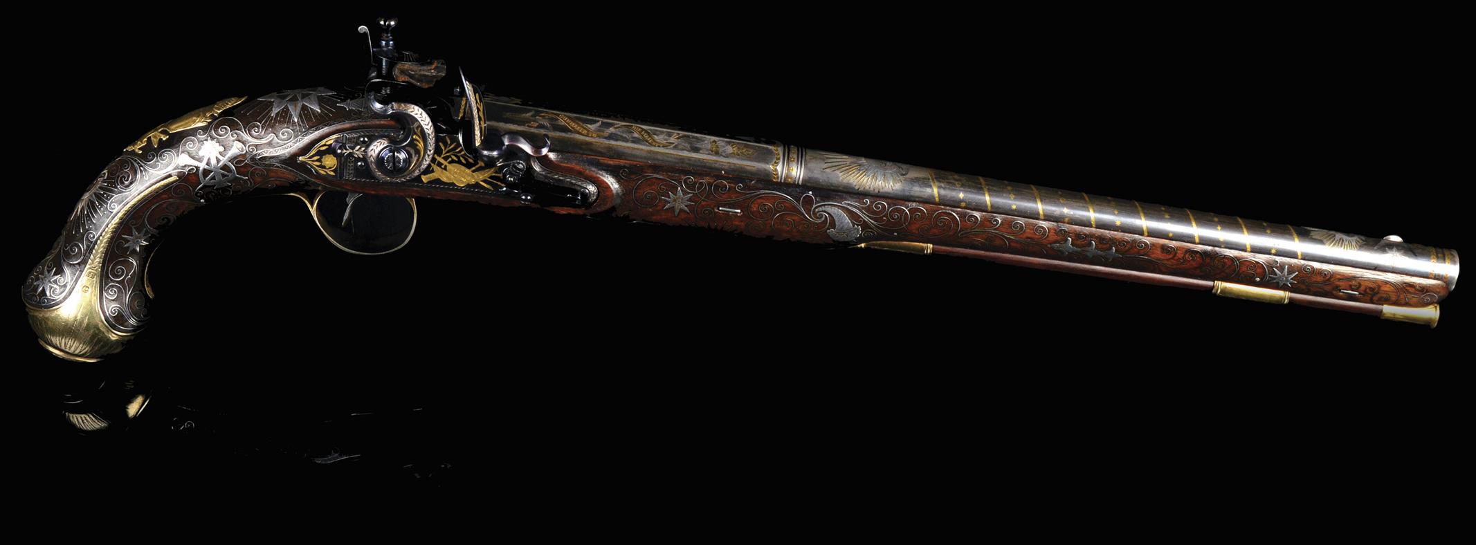 A fine presentation flintlock pistol by H.W. Mortimer, blued and gilt two stage barrel 14.5 in., silver and gilt decoration including two gold bands at the muzzle engraved with darts and separated by a line of small stars, silver front sight surrounded by four stars, round part of barrel with spiral gold bands separated by lines of alternating stars and pellets, motif of a crescent superimposed on a radiant star repeated twice, faceted rear part with gold and silver dart engraved borders, 'H.W. MORTIMER' to the top flat, flanking faces with gold banners engraved with flowers and 'GUNMAKER TO HIS MAJESTY', gold touch hole, London proof marks, hooked breech, tang decorated en-suite to the barrel, blued and gilt lock similarly adorned with stars and rays to the top jaw of the cock and darts and plumes to the frizzen, lock plate with 'H.W.MORTIMER LONDON' to a gold oval amid martial motifs, full stock with profuse scrolling silver inlay involving stars, cornucopias, crescents, and musical instruments; silver-gilt furniture comprising side plate, escutcheon, trigger guard and pommel, all with relief decoration including stands of arms, the last two hallmarked for Birmingham 1800, ramrod (possibly later) equiped with worm under screw-off cover, in a fitted brass mounted mahogany box (possibly later), with a selection of associated accessories.