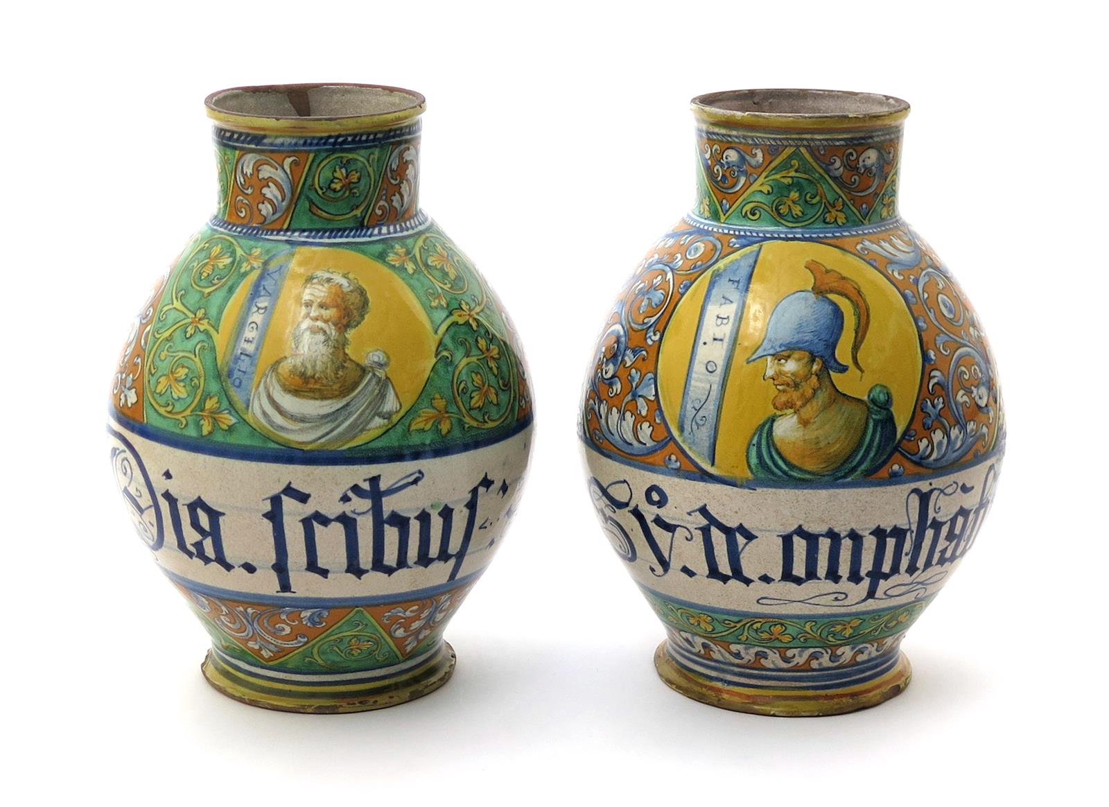 A pair of Faenza maiolica albarelli mid 16th century, the large baluster forms painted with portraits of bearded men on a yellow ground, one inscribed 'Vargel' the other 'Fabio', each above a cartouche inscribed 'Sy. De onphafu' and 'Dia. Fribuf' respectively, reserved on elaborate foliate panel grounds, some restoration, 32cm. (2)