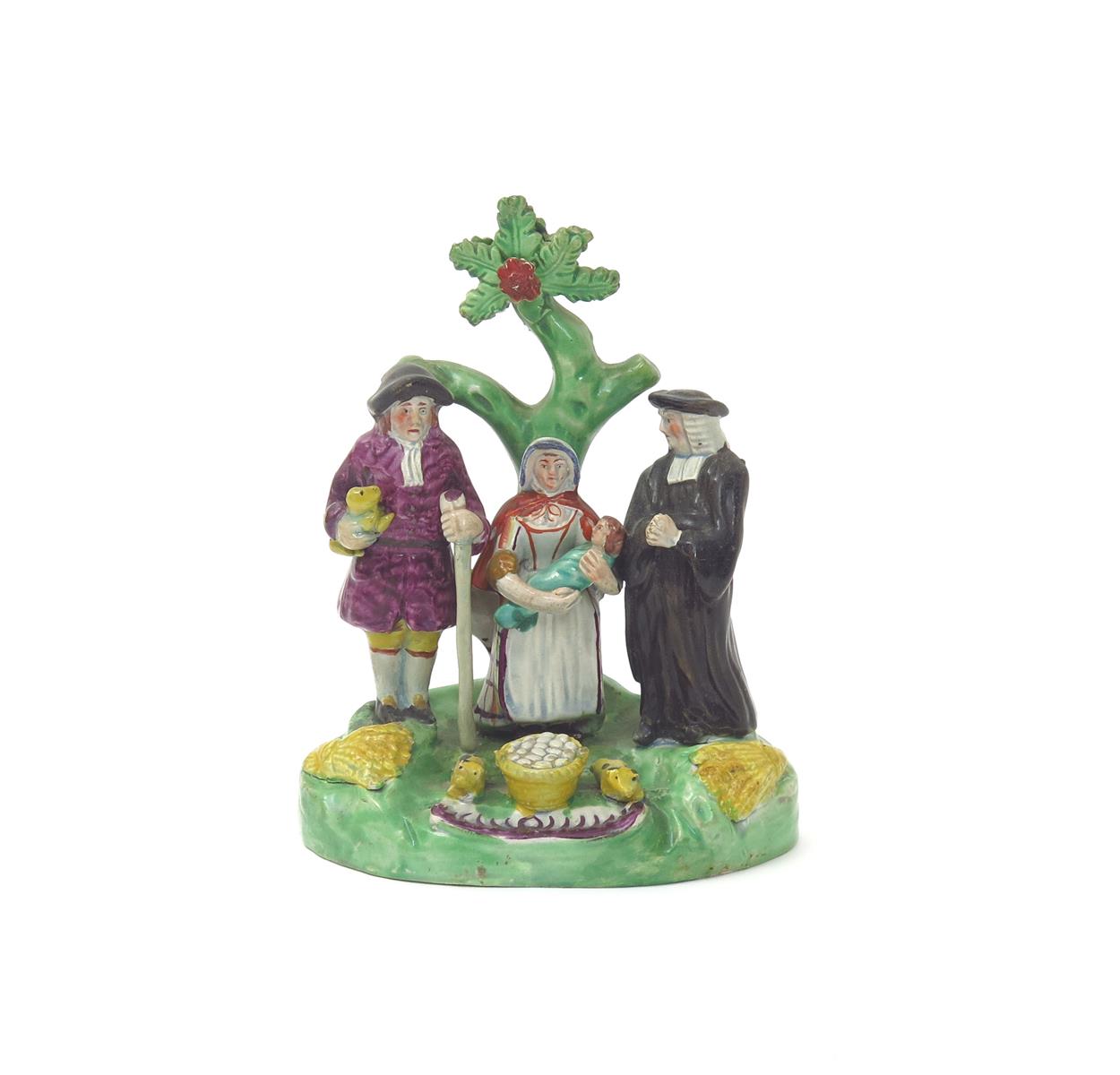 A Staffordshire Tithe Pig figure group c.1820, a couple standing beneath a tree with a clergyman before two pigs, sheaves of corn and a basket of eggs, the man holding a small dog, the woman a baby, some good restoration, 16.5cm high.