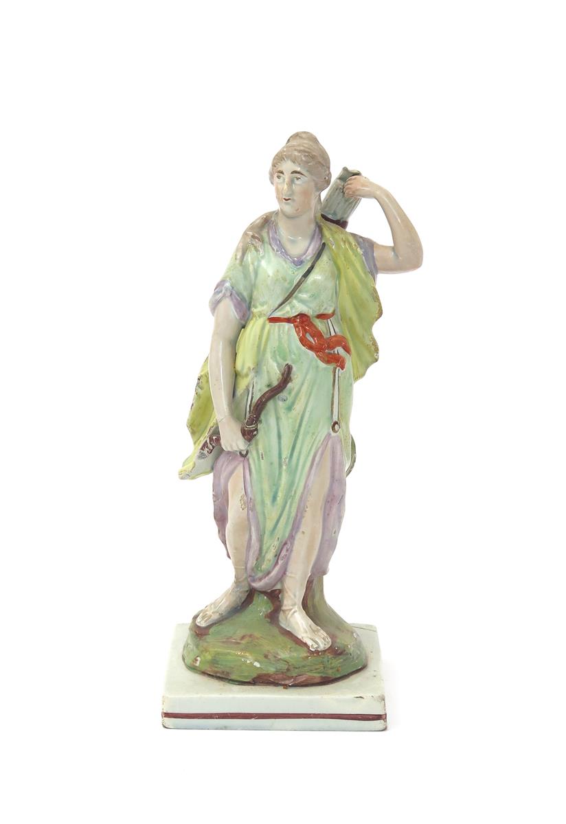 A large Staffordshire figure of Diana c.1790-1800, standing before a tree stump and taking an arrow from a quiver slung on her back, her bow held in her right hand, raised on a square base, a repaired chip to the back of the base, 29cm.