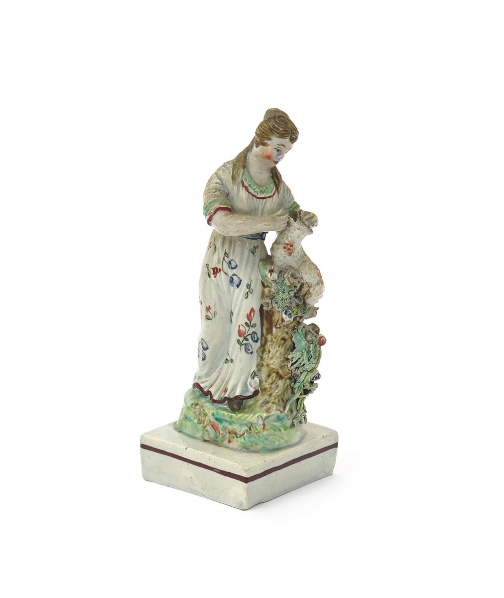 A Staffordshire figure of a shepherdess c.1800, standing and tending a lamb which sits atop a tree trunk beside her, raised on a square base, some wear, 19.6cm.