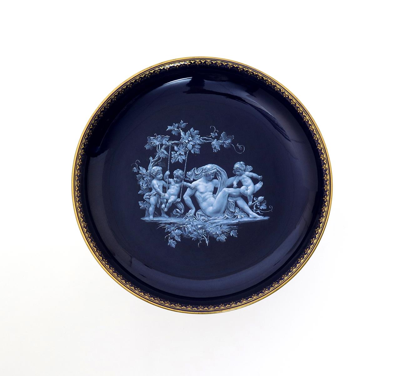 A good Meissen pâte-sur-pâte cabinet plate late 19th century, finely decorated with a bacchanalian scene emblematic of Autumn, of the young god playing with three putti beneath a branch of fruiting grapevine, on a rich blue ground, the rim with a delicate foliate gilt border, blue crossed swords mark, titled to the reverse with 'Herbst nach Hundrieser', 26cm.