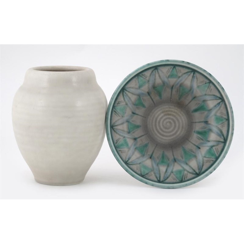 A Pilkington's Royal Lancastrian bowl, by Gladys Rogers and E T Radford, dated 13th November 1930, painted with lotus flower design in blue and green on a silver ground, and a Royal Lancastrian vase by E T Radford impressed and incised marks 21cm. diam.