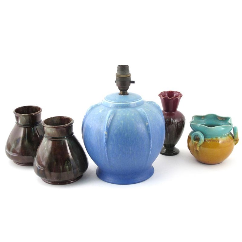 A Pilkington's Royal Lancastrian lampbase gourd form, covered in a mottled blue glaze, and a Watcombe jardiniere and three other vases various marks, minor damages lamp 24cm. high