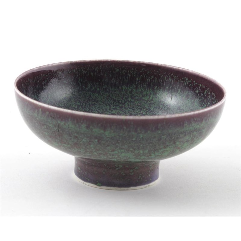 A Ruskin Pottery high-fired egg shell bowl, on narrow foot, covered in turquoise speckling over purple to inside and out painted scissor mark 10.5cm. diam.