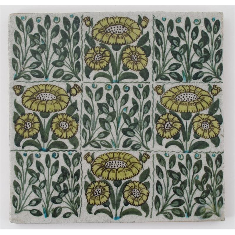 A large William De Morgan tile, painted with panels of flowers and foliage, in shades of yellow, green and blue on a white ground impressed Chelsea Period mark 21cm. square
