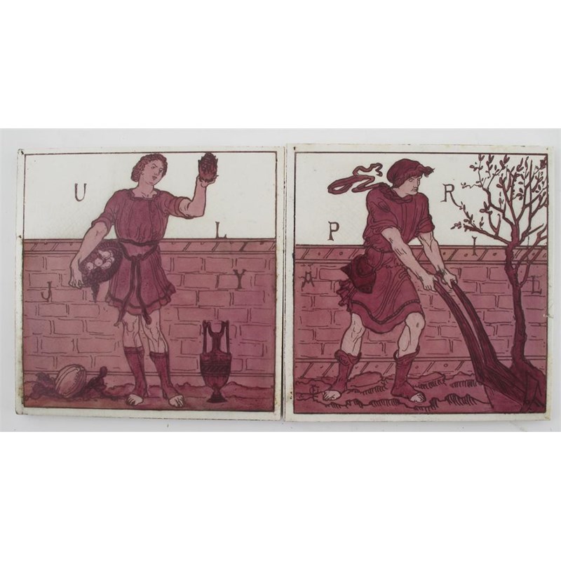 A pair of Craven Dunnill tiles, depicting April and July,  printed and painted in red on a white ground impressed factory marks to reverse 15.5cm. square