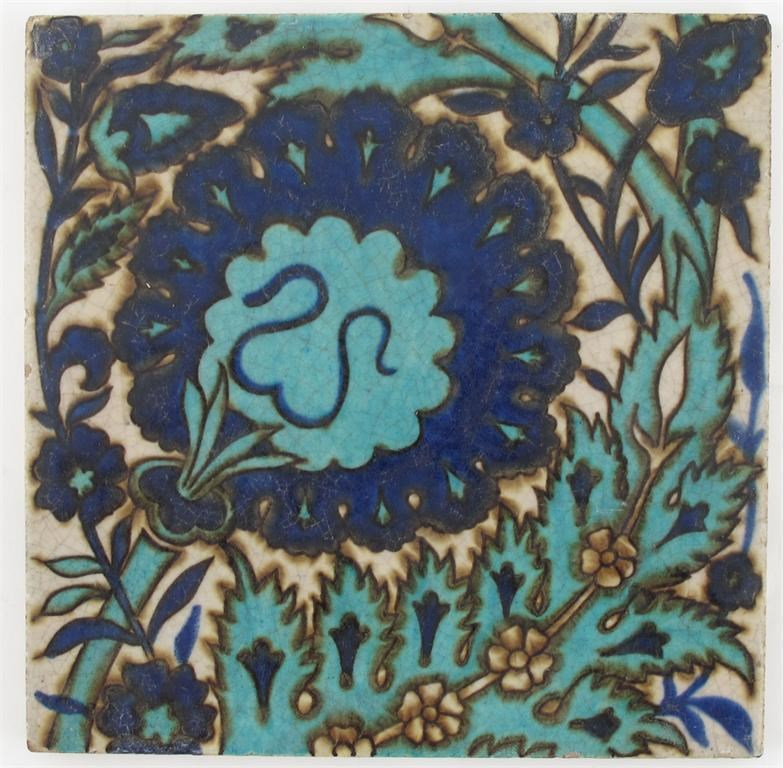 A Persian pottery tile, painted with a stylised flower in shades of blue and green indistinct marks to reverse 15.5cm. square