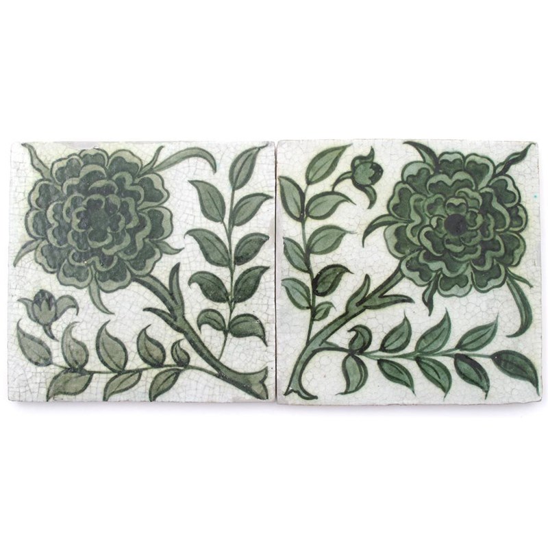 A pair of William De Morgan tiles, each painted in green with a rose stem, on a white ground impressed Chelsea Period mark, minor restoration to rims 15.5cm square