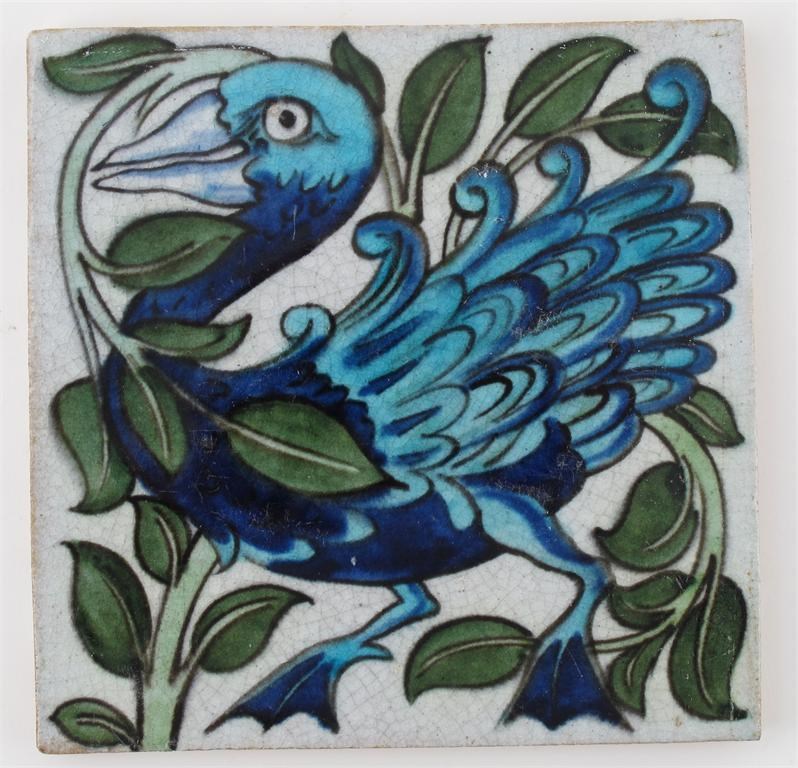 A William De Morgan Persian Duck and Foliage tile painted in shades of blue and green on a white ground impressed Chelsea Period mark 15.5cm. square