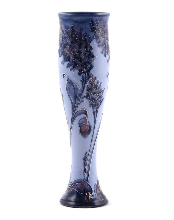 'Lilac' a Moorcroft Pottery Florian ware vase, designed by William Moorcroft, painted in shades of blue, highlighted in pink, on a pale blue ground printed mark, painted green signature 20cm. high