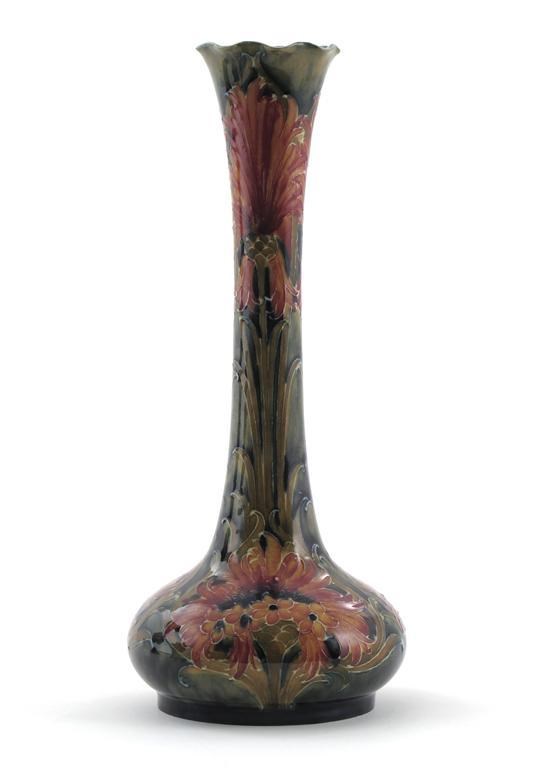 'Chrysanthemum' a James Macintyre Pottery solifleur vase, designed by William Moorcroft, painted in shades of pink, ochre and green printed mark, painted green signature, professional restoration to the fluted top rim, 25cm. high